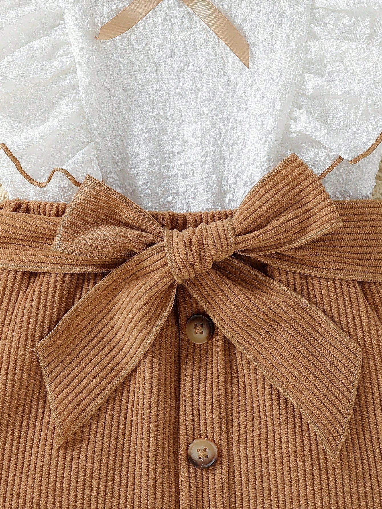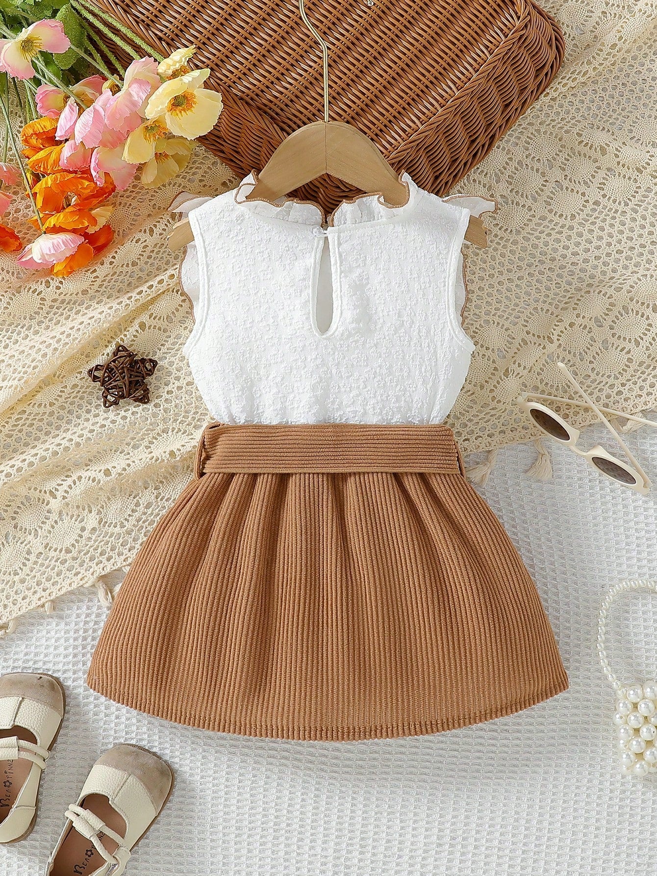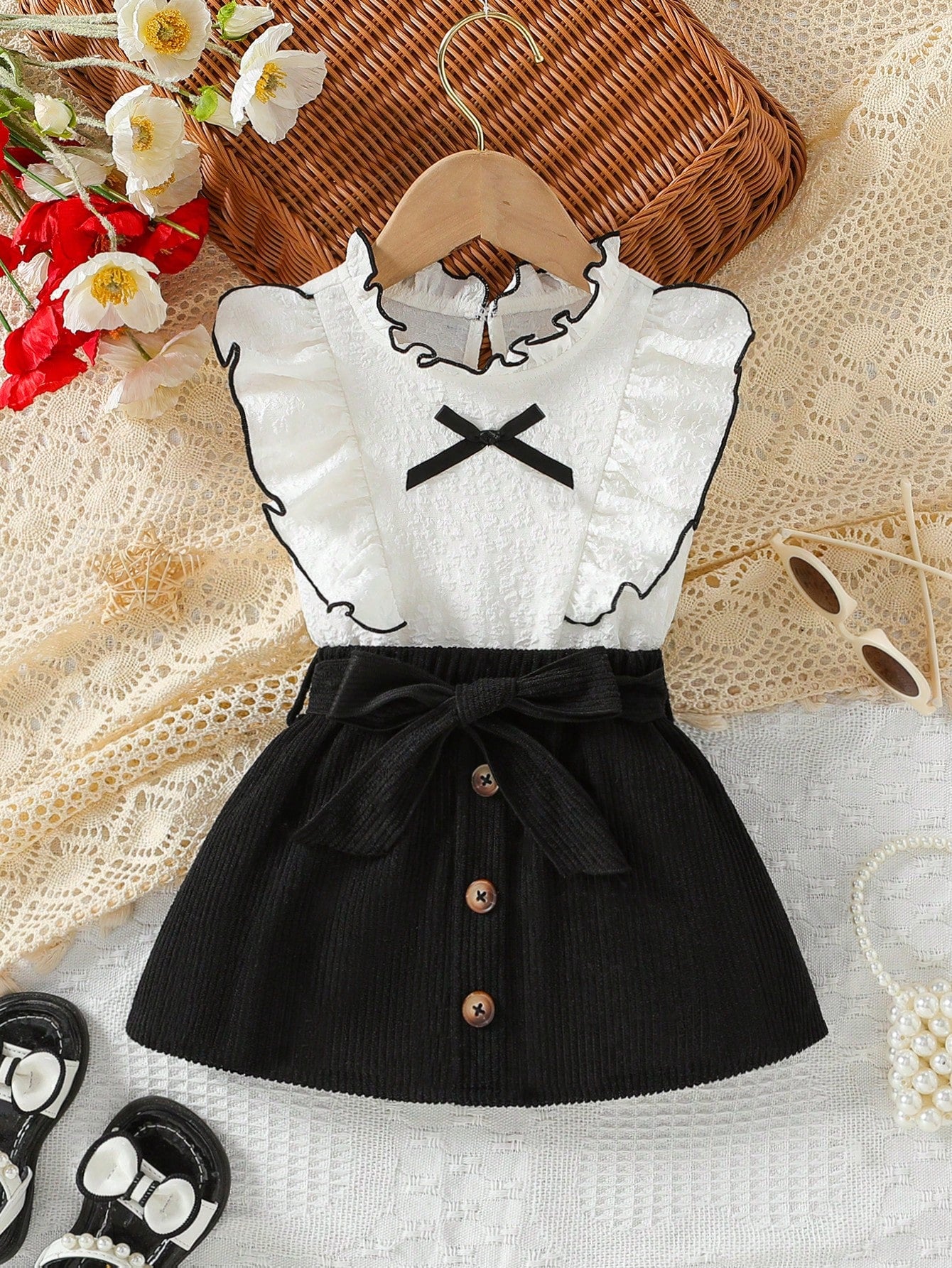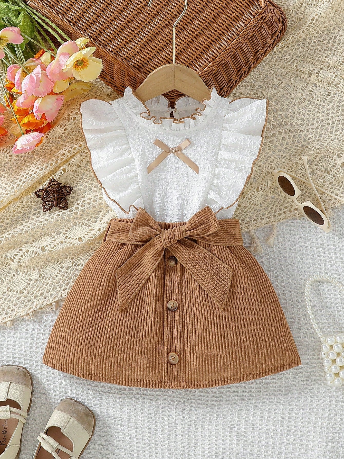 مجموعة جميلة لأنثى الرضع تتألف من بلوزة بحواف بكمات وتنورة مع تزيين عقدة الحزام، مناسبه لفصل الصيف