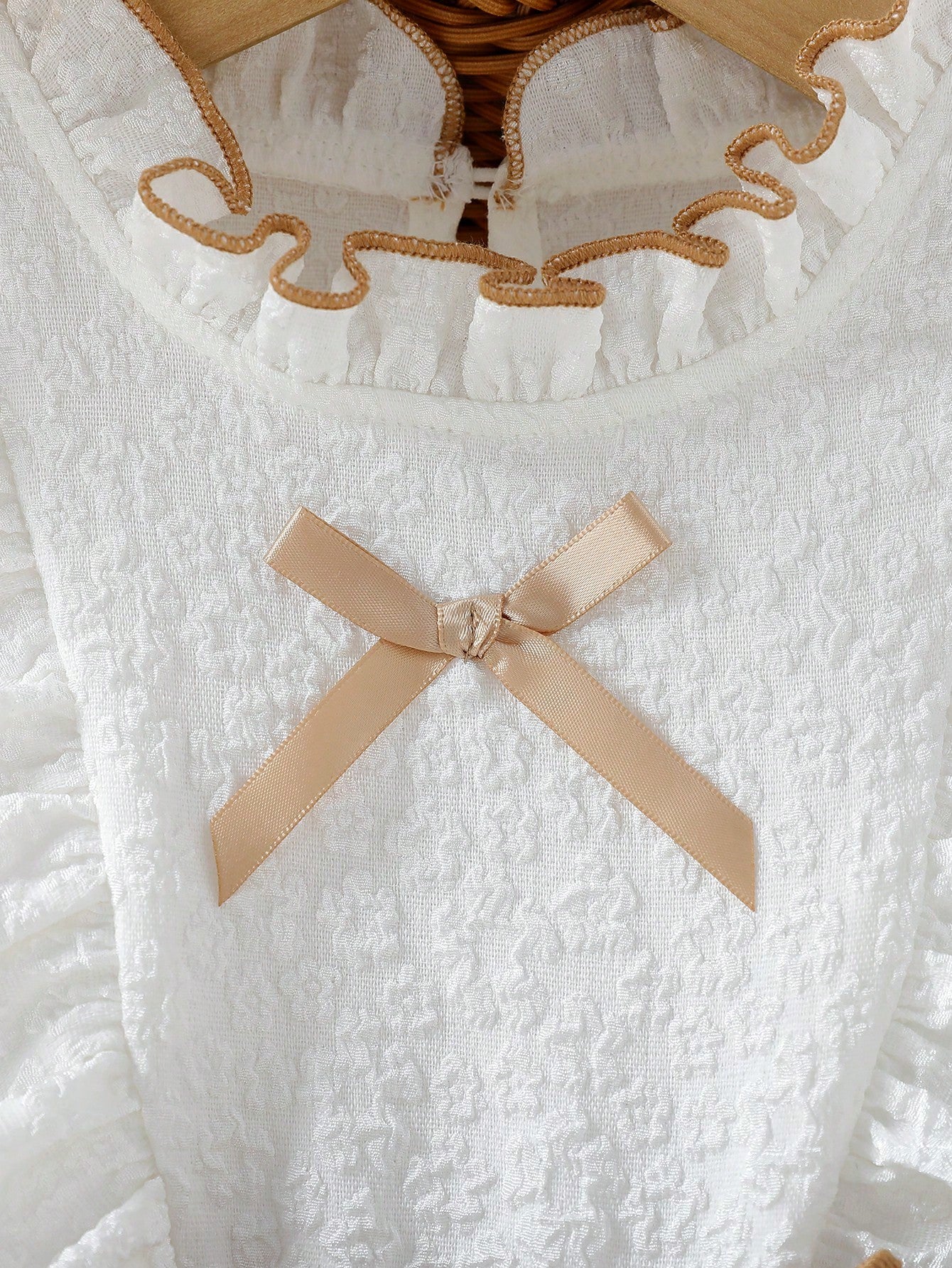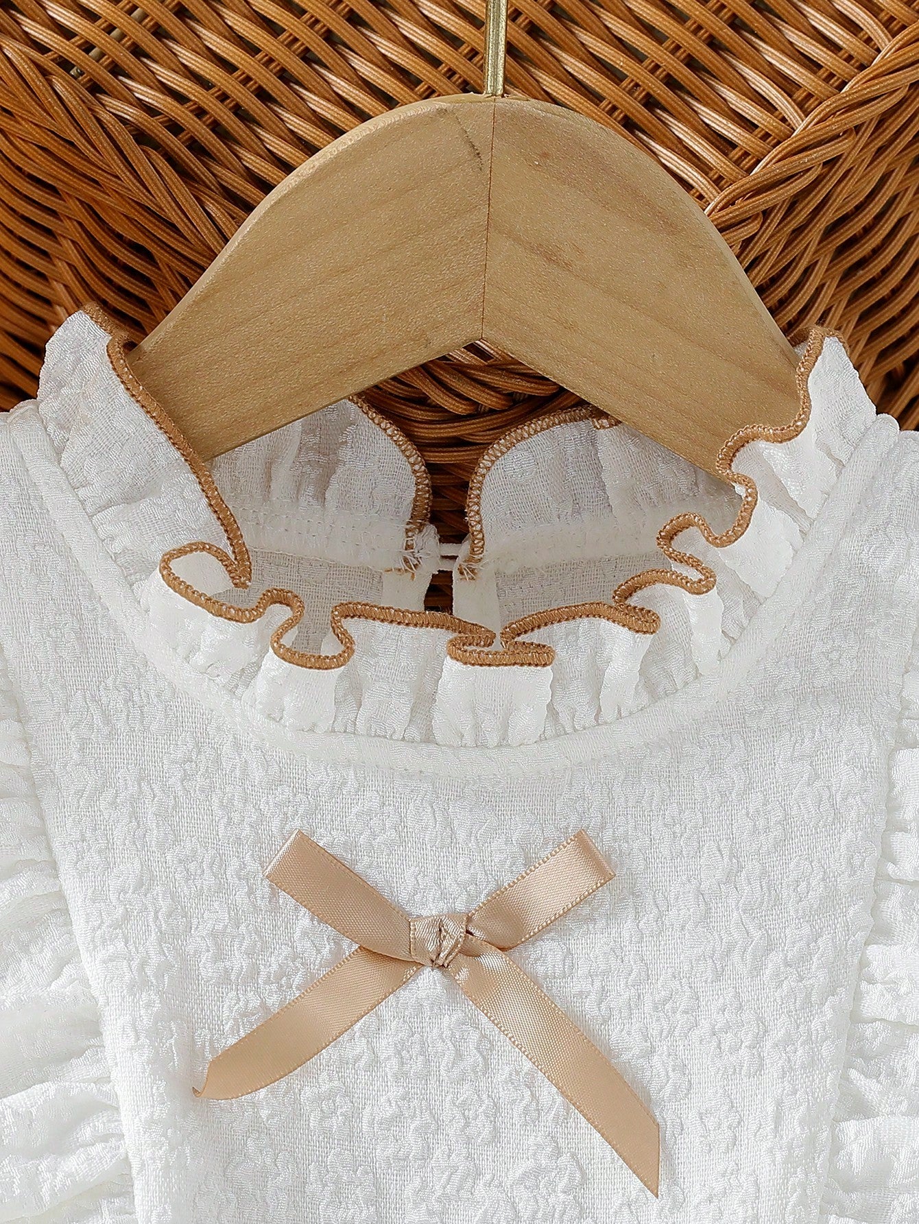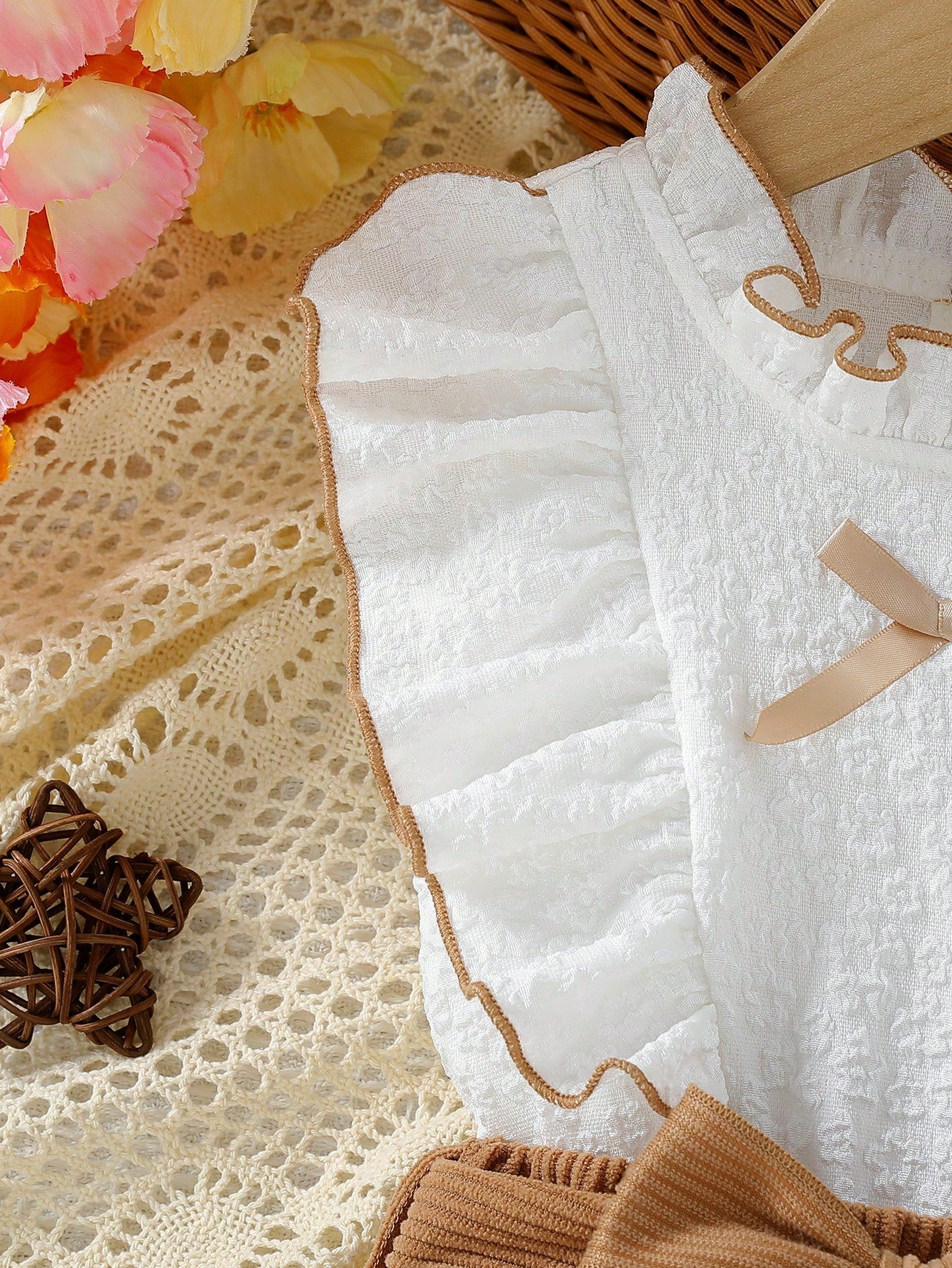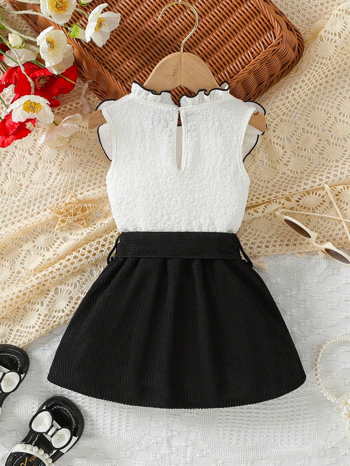 مجموعة جميلة لأنثى الرضع تتألف من بلوزة بحواف بكمات وتنورة مع تزيين عقدة الحزام، مناسبه لفصل الصيف